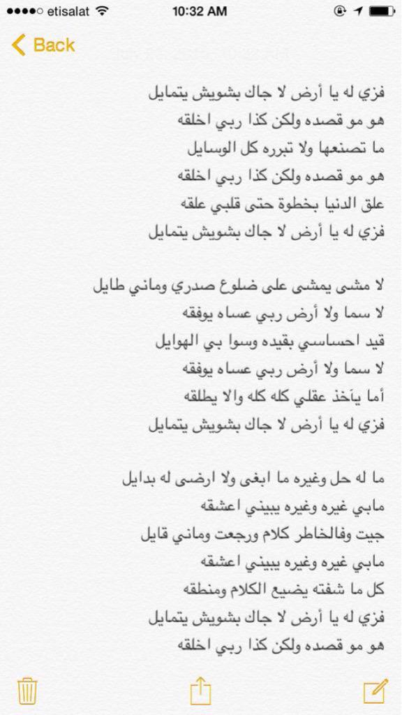 فزي له ياارض لا جاك بشويش وتمايل هو مو قصده ولاكن كذا ربي خلقه. فزي له يا ارض لا جاك بشويش يتمايل هو مو قصده ولكن كذا ربي خلقه ما تصنعها ولا تبرره كل الوسايل هو مو قصده ولكن كذا ربي خلقه علق الدنيا بخطوة حتى قلبي علقه فزي له يا ارض لا جاك بشويش. اسمعني 2015 from album. سعود البابطين الحان.