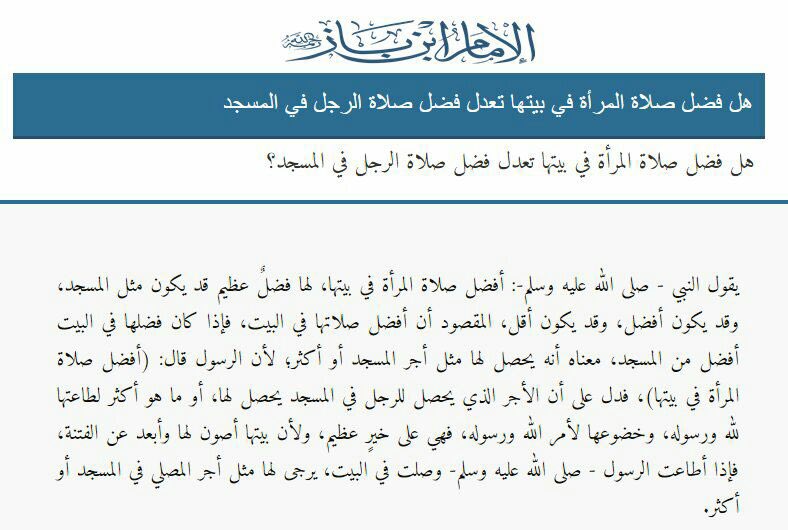 المرأة فتنة يجب صونها وحجبها عن الرجال ما استطاع ولي أمرها ذلك والرسول صلى الله عليه وسلم فض ل أن تصلي المرأة في بيتها وجعل أجر صلاتها تلك أفضل من صلاتها في المسجد. ننتقبل بعد ذلك إلى الرياض والسائلة. هل فضل صلاة المرأة في بيتها تعدل فضل صلاة الرجل في المسجد. أنها جاءت النبي صلى الله عليه وسلم فقالت.