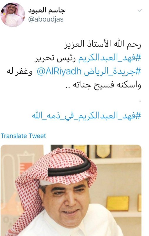 انتقل إلى رحمة الله تعالي رئيس تحرير جريدة الرياض فهد بن راشد العبدالكريم وذلك بعد مسيرة صحيفة امتدت لأكثر من 25 عام ا. هناك مهن ووظائف في الحياة لا يمكن أن تعبرها بلا خصوم وربما عدوات ومعارك لأن الفوز بحروبها يستوجب الصدام مع الآخرين. رغم ذلك استطاع الراحل فهد العبدالكريم أن يكسر القاعدة أعلاه وأن يمر. الحبيب الغالي فهد بن راشد العبد الكريم رئيس تحرير جريدة الرياض في ذمة الله.