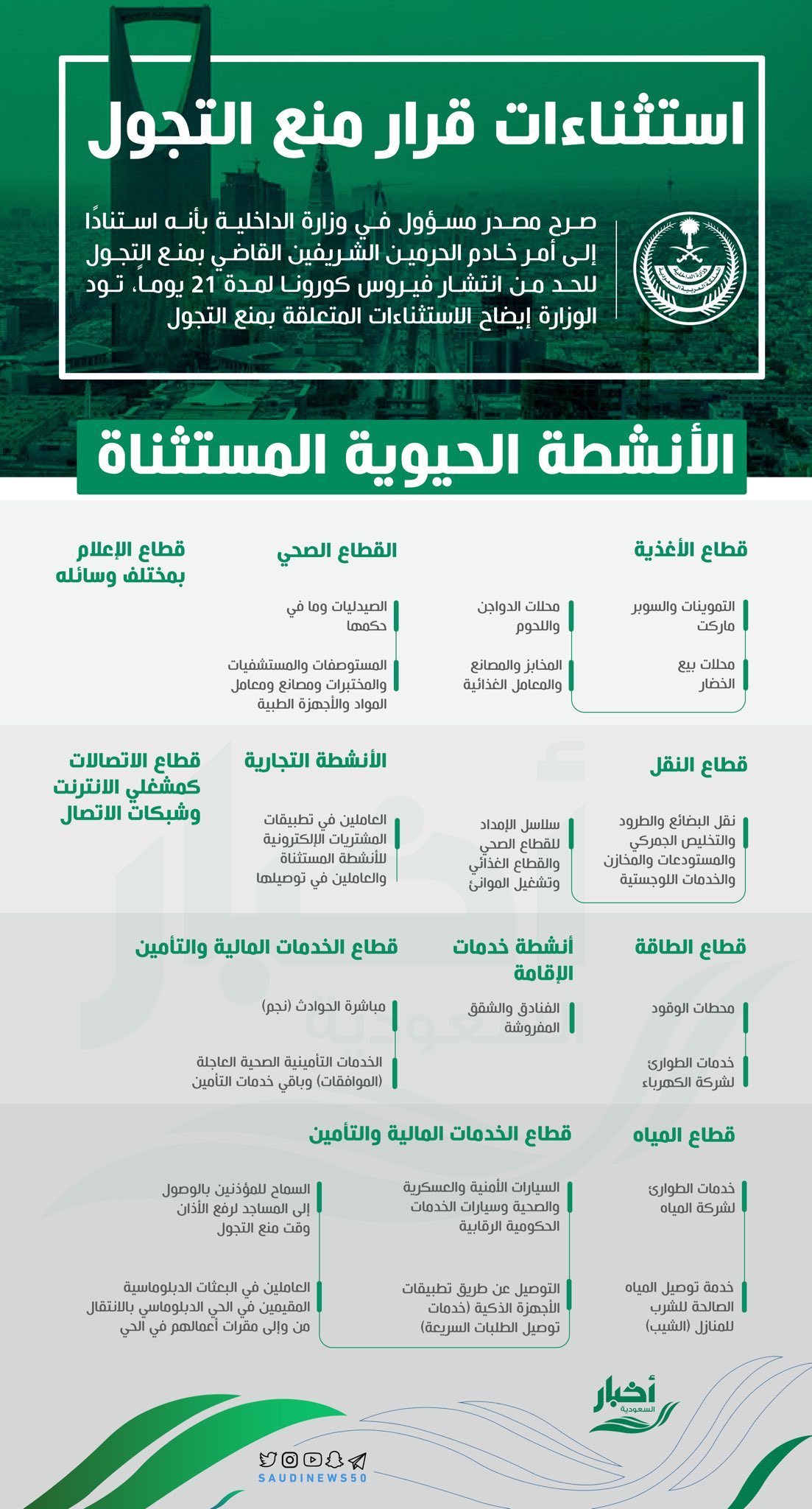 أعلنت وزارة التجارة السعودية عن استثناء أنشطة جديدة من قرار منع التجول على مدار 24 ساعة يوميا إضافة للأنشطة المستثناة سابقا. وقالت الوزارة عبر حسابها الرسمي على تويتر إنه تم إضافة أنشطة فنيو. عام صدور أمر خادم الحرمين الشريفين برفع منع التجول جزئيا في جميع مناطق المملكة ابتداء من اليوم الأحد مع الإبقاء على منع التجول الكامل في مكة المكرمة والأحياء المعزولة سابقا. وكالة الانباء السعودية.