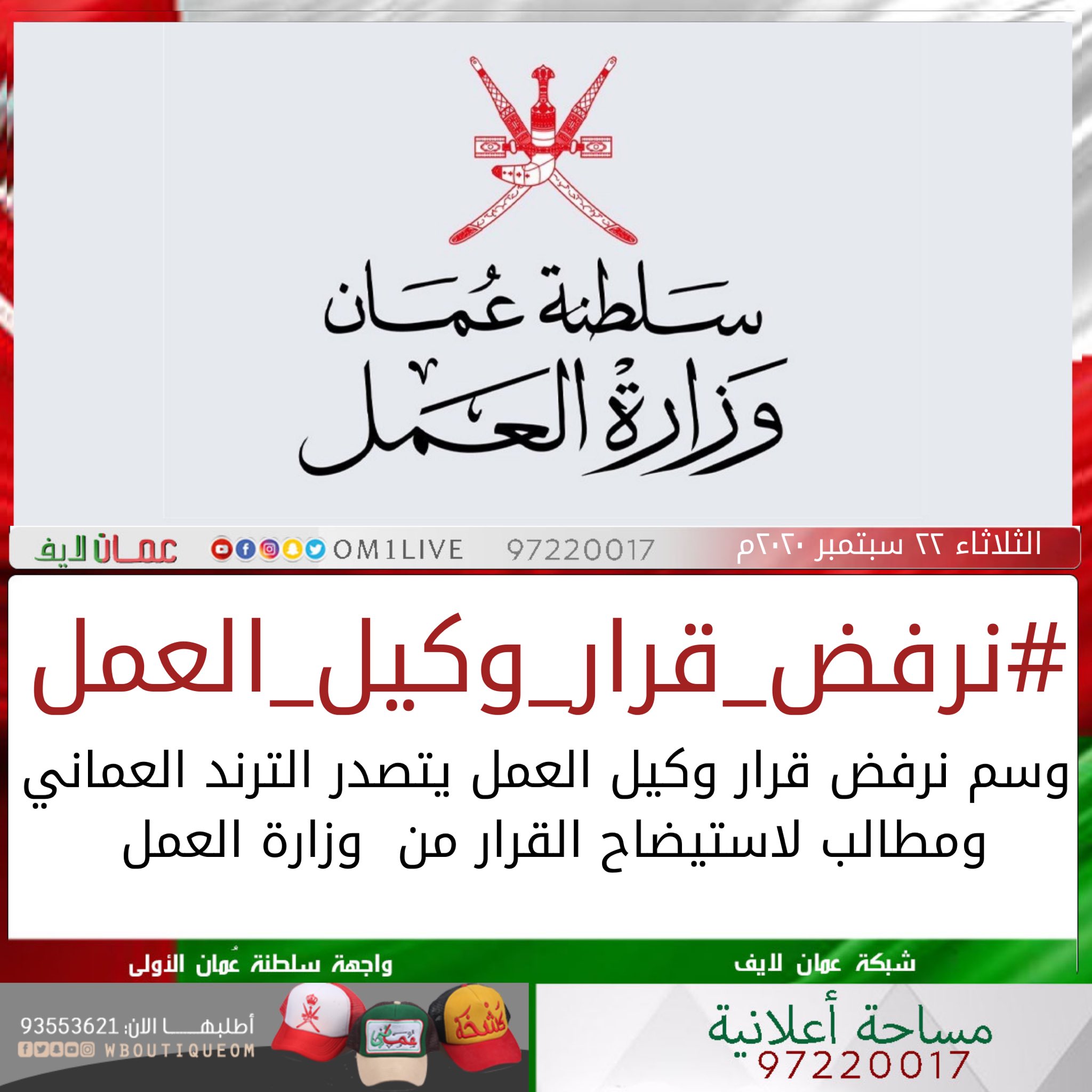 قرار وكيل وزارة العمل في سلطنة عمان. وزارة العمل سلطنة عمان. قال سعادة المهندس حمد بن علي النزواني وكيل وزارة الإسكان والتخطيط العمراني السلطنة تتبنى برامج وسياسات تنويع مصادر الدخل وتعزيز مكانتها الاستثمارية في القطاع العقاري. تشكل النقابات العمالية اتحادا عاما لعمال سلطنة ع مان يمثلهم في الاجتماعات. ونتائج المسوحات مع نهاية 2018م وجود نحو 191 ألف مؤسسة مشغلة مسجلة في وزارة العمل ونحو 173 ألف.